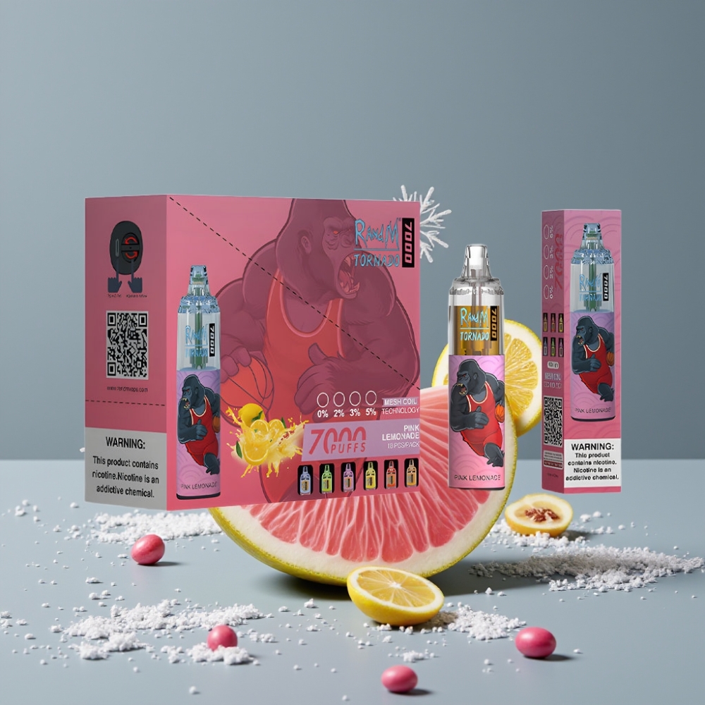 RandM Fumot Tornado 7000 نَفَثات بنكهة الليمون الوردي مع بطارية 850 ميلي أمبير وإضاءة RGB
